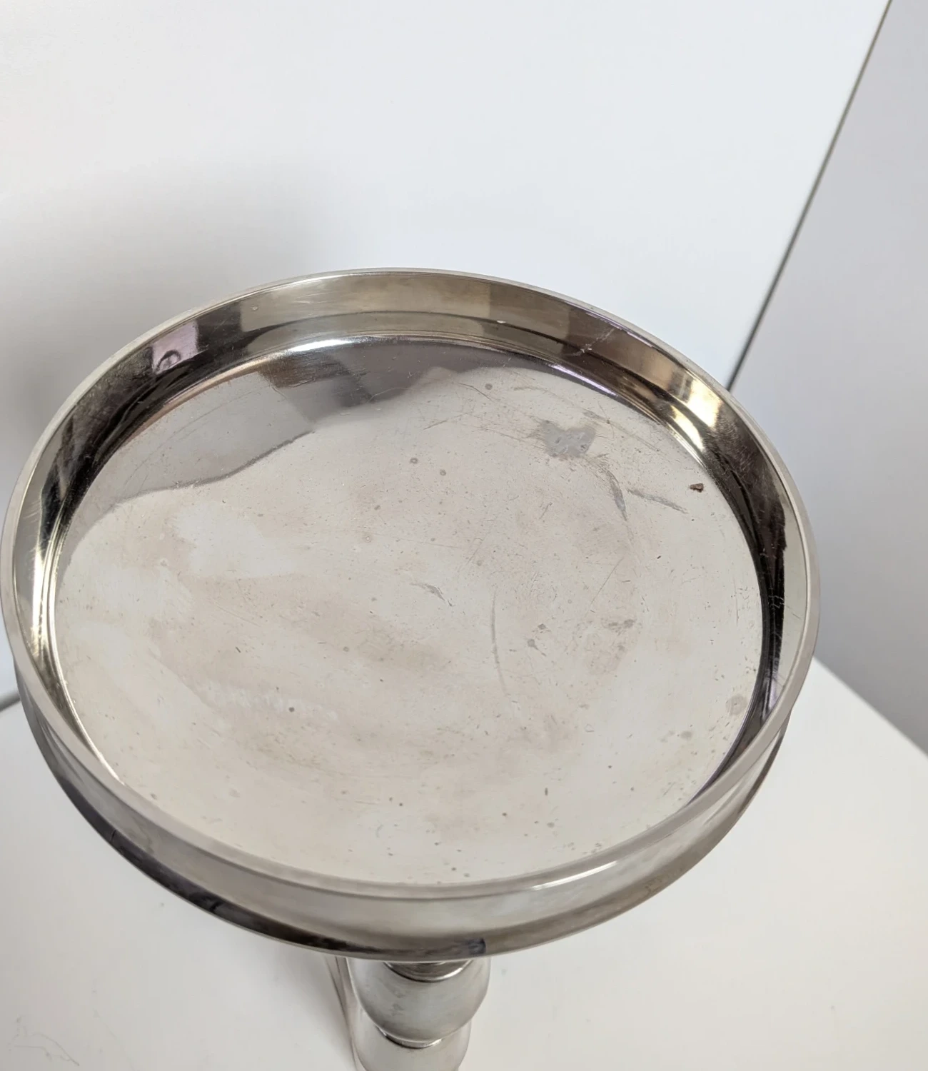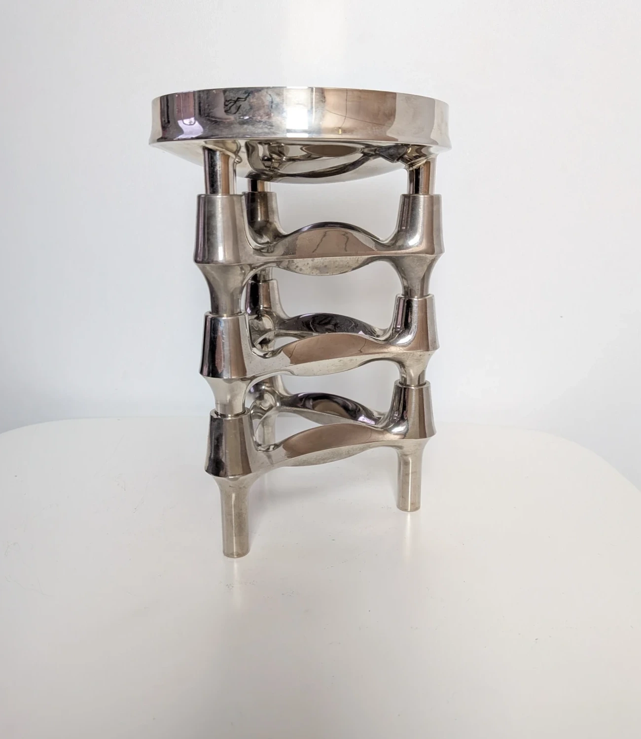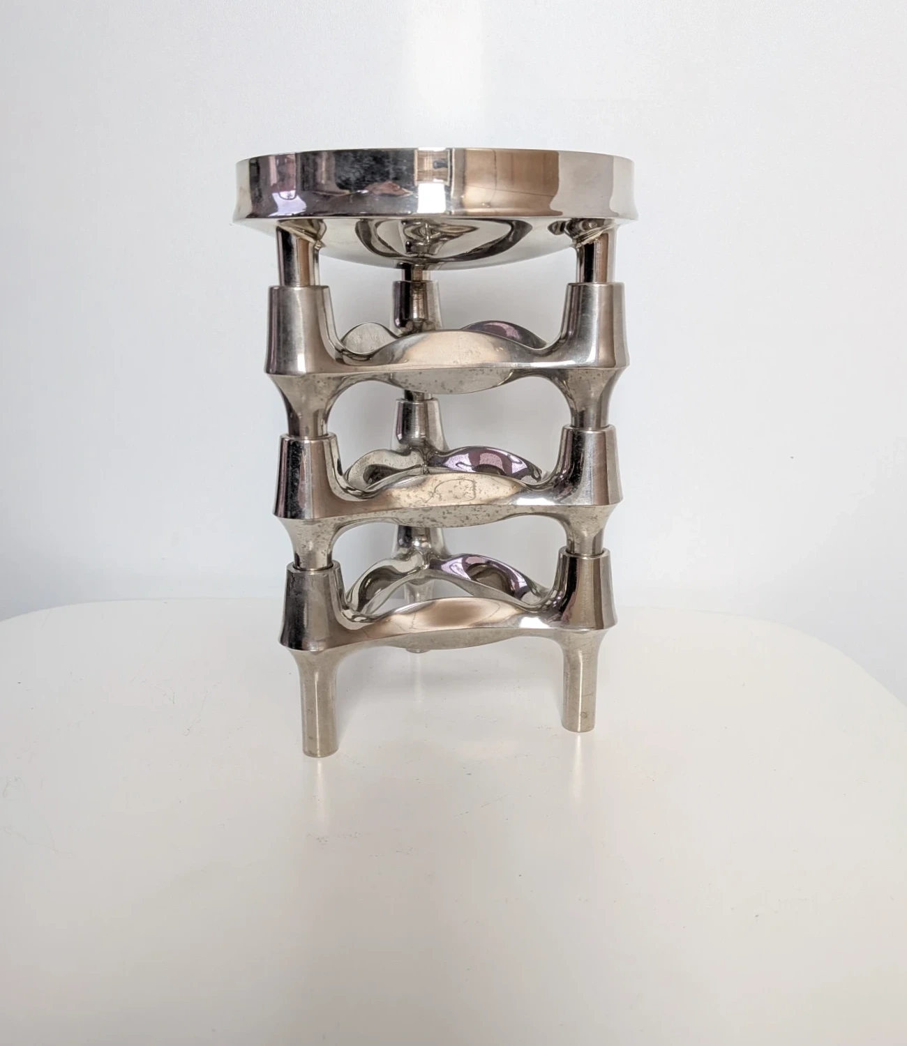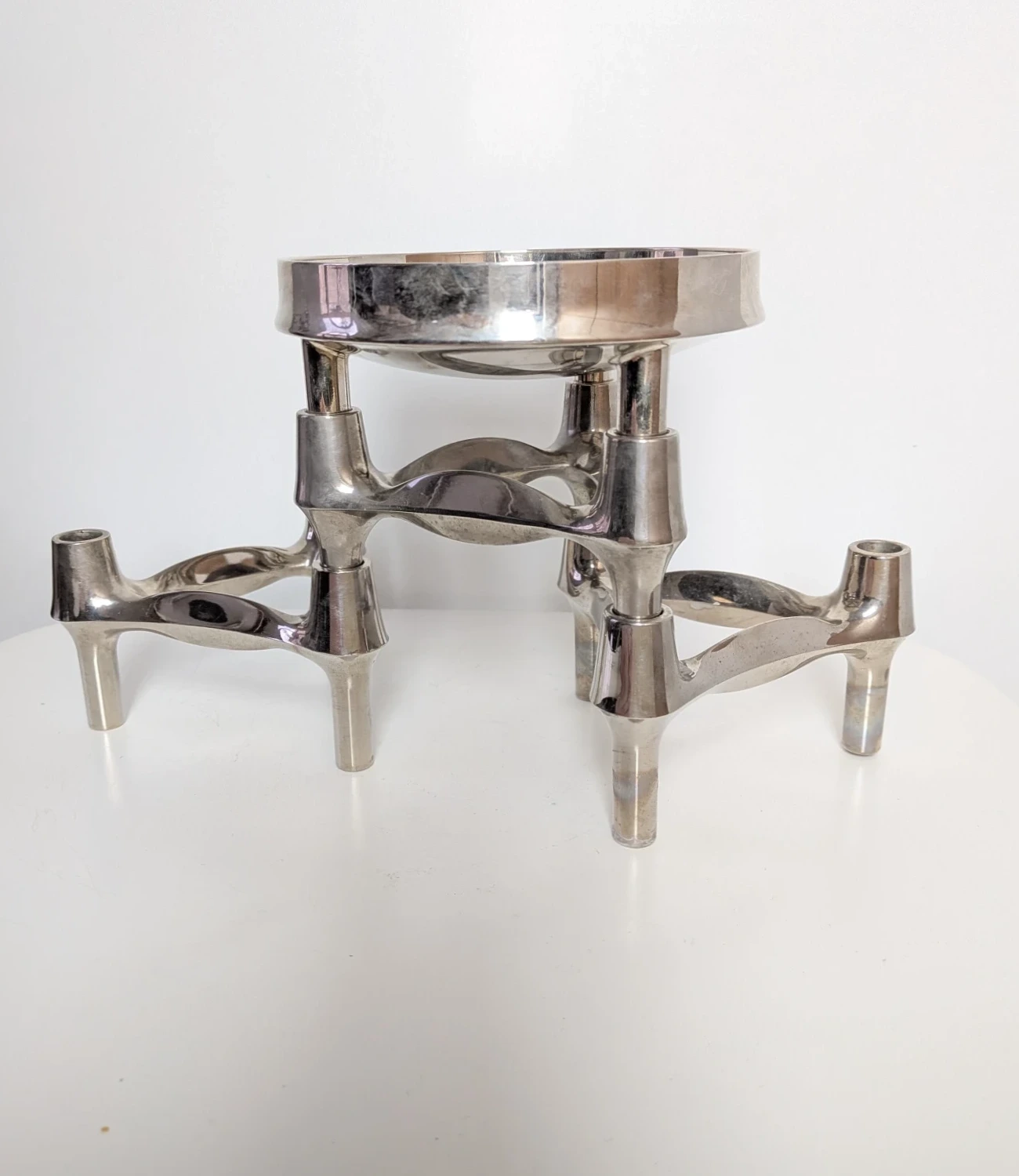 Lot de 3 bougeoirs BMF « Combi-leuchter » + une coupelle d’occasion, des années 70, en métal chromé.