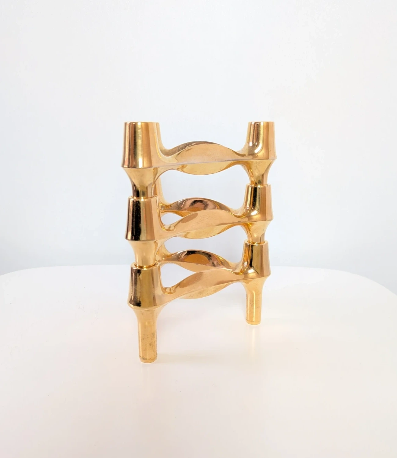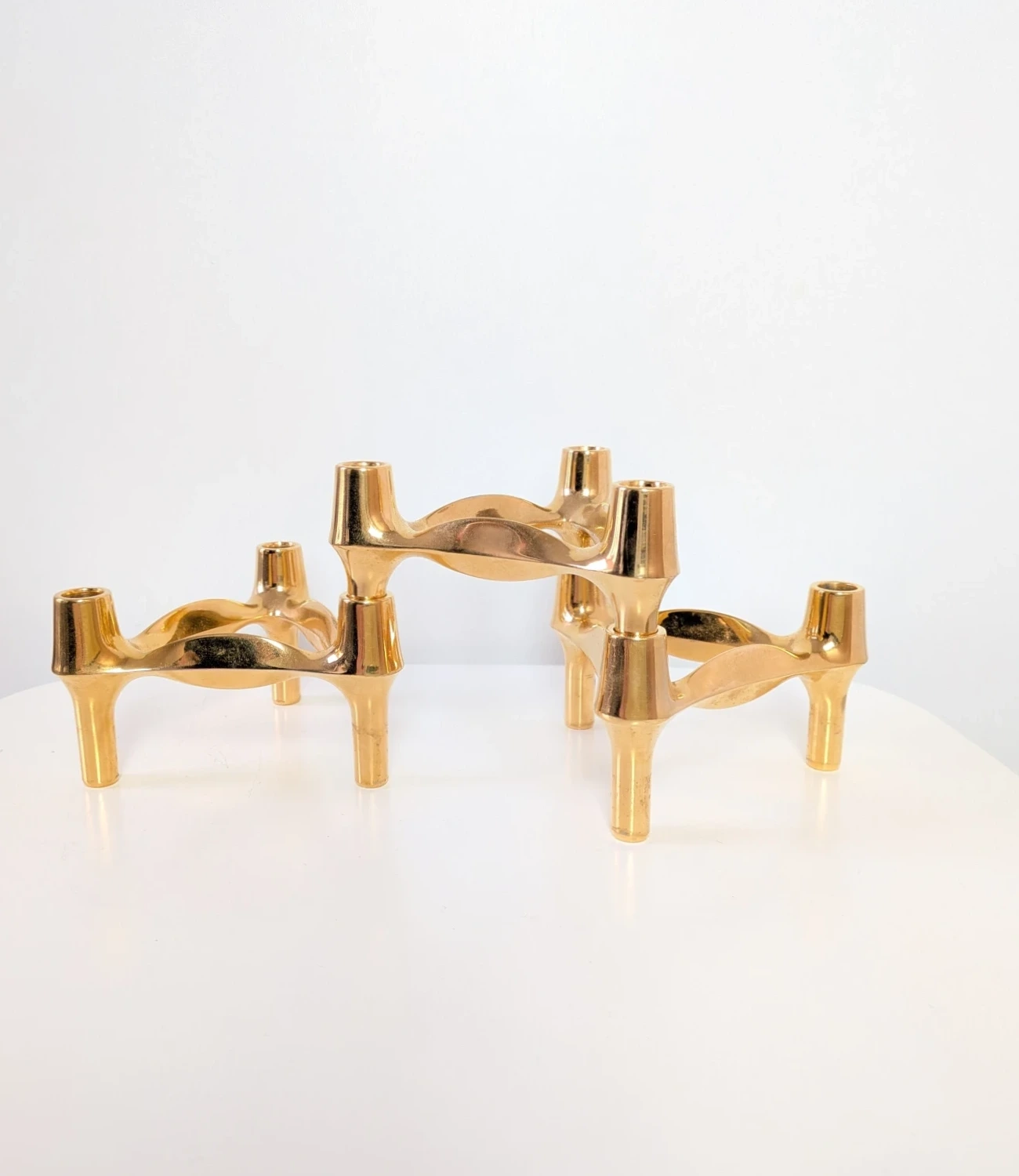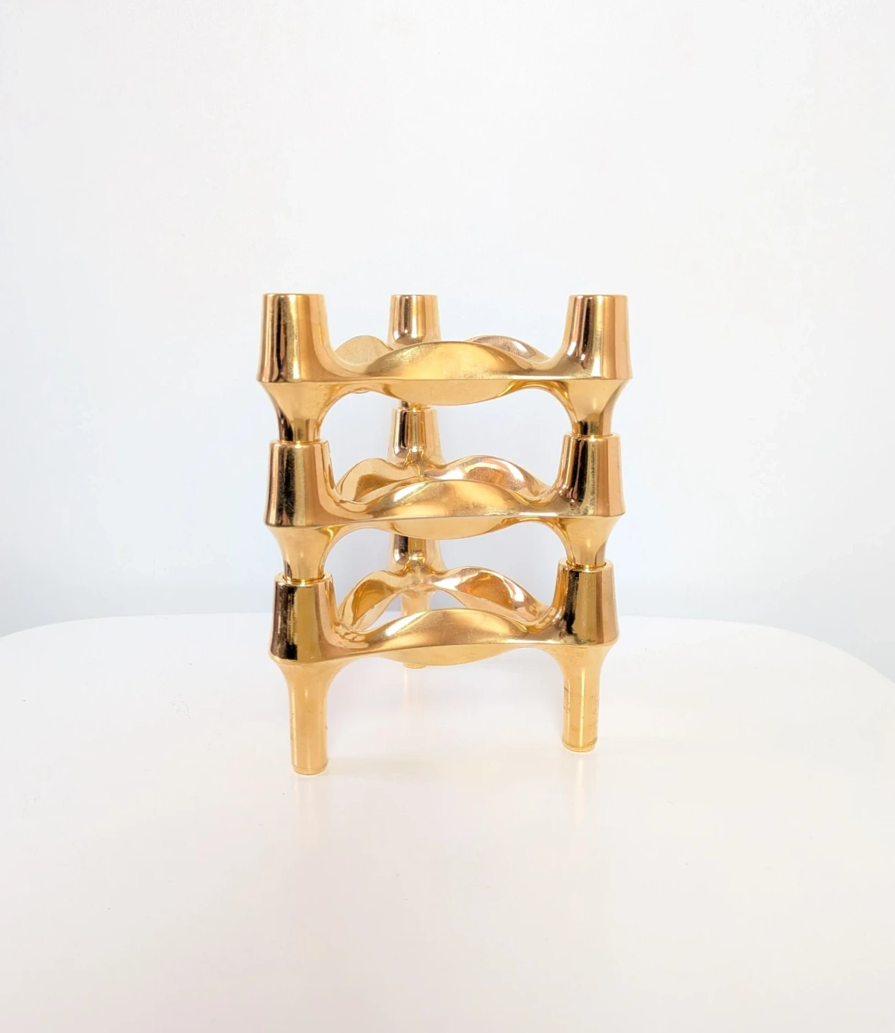 Lot de trois bougeoirs BMF « Combi-leuchter » d’occasion, des années 70, en métal doré.