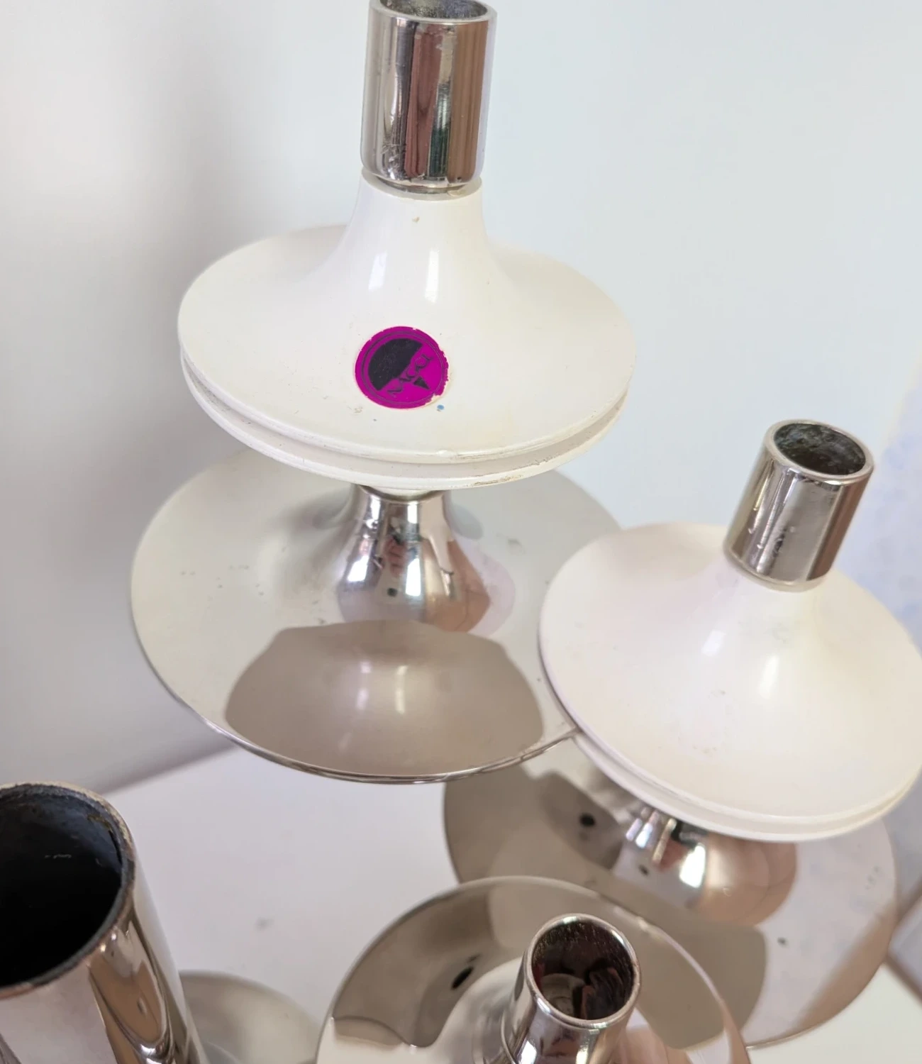 2 bougeoirs sont chromés, 4 sont chromés et blanc (la partie blanche est en plastique).
