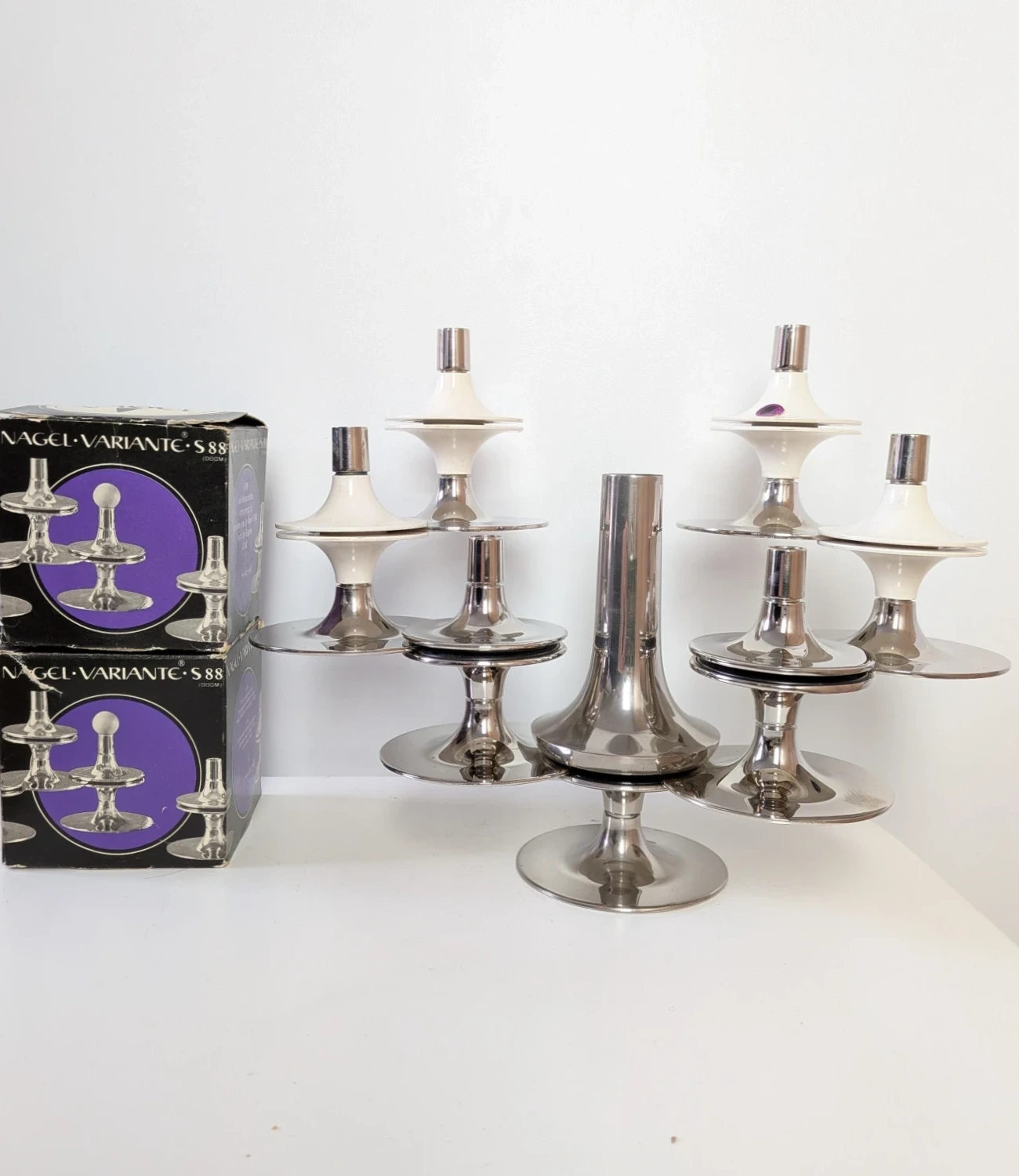 6 bougeoirs Nagel des années 70, modèle S88, avec un pied / vase S880, avec deux boîtes d’époque.