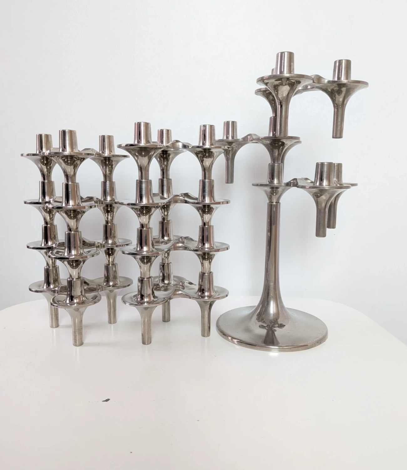 Aller au contenuLot de 8 bougeoirs BMF modèle « Orion » en métal chromé, avec une base comprenant 3 bougeoirs indissociables (soit 11 bougeoirs en tout).