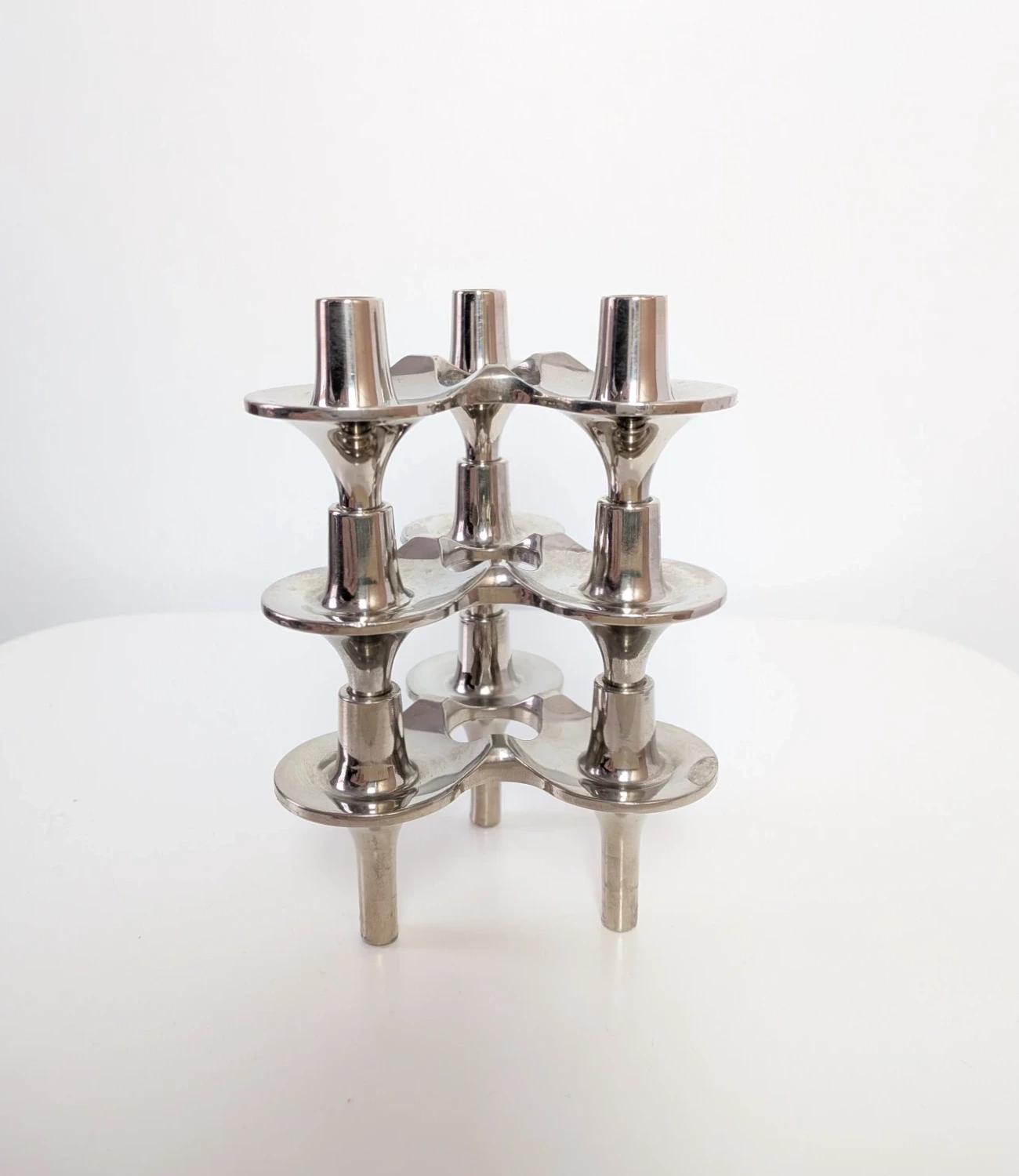 Lot de 3 bougeoirs BMF modèle « Orion » en métal chromé, en excellent état.